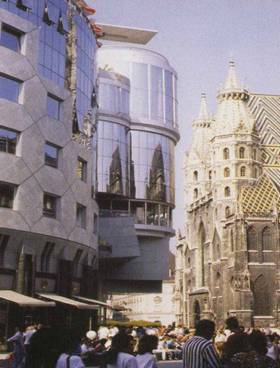 哈斯購物中心位於維也納市中心之聖史蒂芬大教堂對面,基地地段顯眼,最大的挑戰在於如何與四周的古典氣氛做協調,以及和聖史蒂芬大教堂之間的呼應與對話。圓形的主體並且使用玻璃帷幕做成的外牆,直接倒影出聖史蒂芬大教堂的影像,形成現代與古典建築的時光交錯,古今相映的景象。哈斯購物中心呈弧型,因為此地羅馬時代所造的城是弧形,故豪萊希望以其脈絡去塑造她的量體,並且使用羅馬式、哥德式的比例,與基地的史帝芬教堂做呼應。