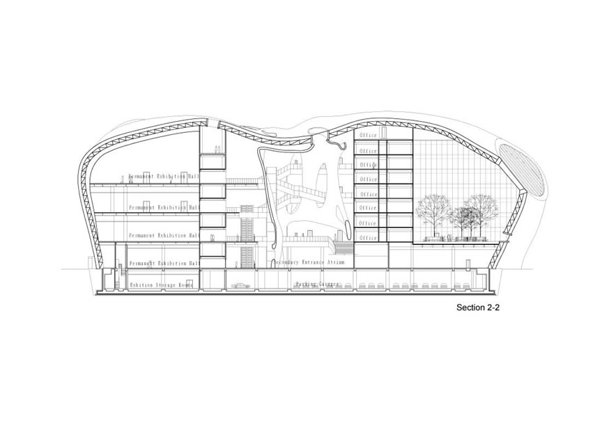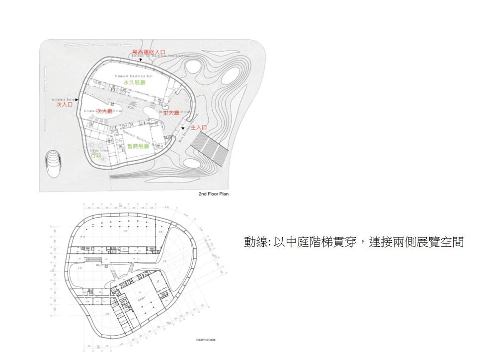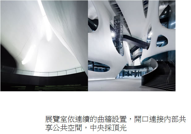 總結: 以有機型態與金屬外殼呈現未來感,內部以挑空中庭與交錯通道連接各層展覽空間,增加流動性與觀者體於藝