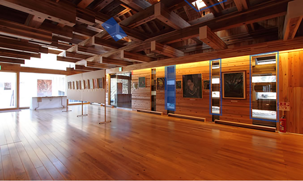 藝廊斜屋頂開有高側窗和東西側側面開窗,但採光量不足服務作品的展出,所以輔以間接照明。