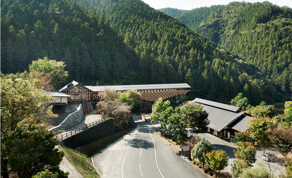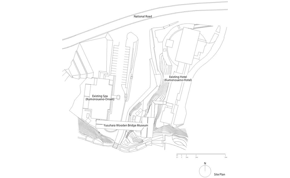 檮原木橋博物館跨越道路連結舊有的雲上溫泉及和雲上旅店,西側位於山壁低處設電梯,東側位高處以藝廊和旅店連結。