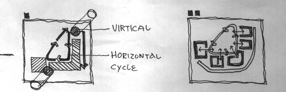以水平單元為區分單位,並且以循環式的方法,讓動線清晰。再由垂直動線將之串連,形成一個整體。