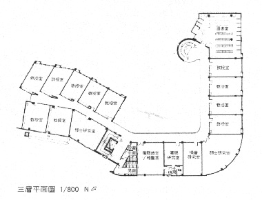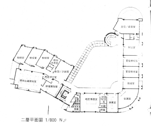 B:基地形狀 C:鄰近建物 D:物理環境。 B:區域紋理 量體上的考量不如線條重視: D:物理環境 在空間配置計畫上,把行政辦公與圖書閱覽空間位於要衝,與教學實驗研究室間產生接觸,共同面對一寧靜安詳、發人於思維的中庭,再以明確之垂直水平動線交織,適中的服務空間安插期間編織成本設計案的綱目。 A.空間序列: