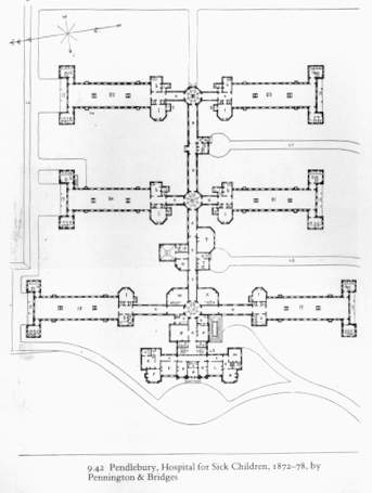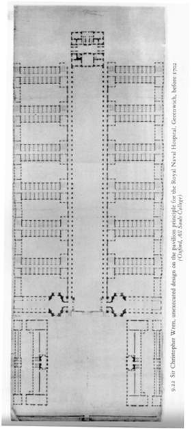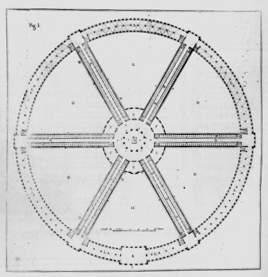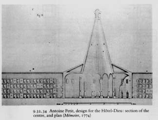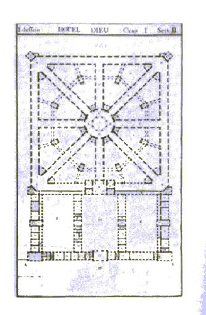 輻射型平面 西元1720年最早出現此種平面形式.由Antoine Desgodets設計外圍一圈也都是病房.見圖11