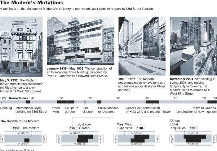 • 綜合性博物館的想法是由第一任館長 巴爾而來,他與希區考克以及飛利浦強生舉辦了第一個在美國的建築展Modern Architecture: International Exhibition自那時以來,紐約現代藝術博物館上演了一系列有影響力的展覽,包括兩個展覽預測1954年和2004年展開,標題是“邁向建築”。典 故來自柯布的宣言。