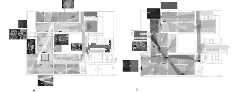什麼樣的敘事使遊客實現他們的移動和做到兩個樓層之間的差異會如何影響他們的探索和參觀的社會角色?為了回答這些問題,我們隨機抽取50人次每層並跟踪他們的路線20分鐘。雖然沒有規定的方式來訪問該畫廊,大多數遊客通過北入口(70%)看到進入集合中的歷史順序