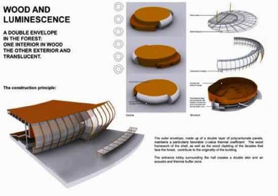 木質材料構成,自然材料讓室內更為舒適。同時也因為音樂廳的基地是一大片的森林,回應當地而選用木材。由聚碳酸酯材料製成的外層結