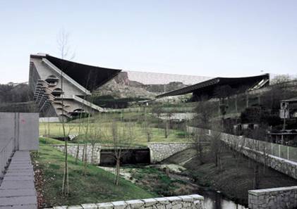 自明性的幾何形式與不定形的天然山體之間的視覺衝突最終在張力的屋面找到了契合點