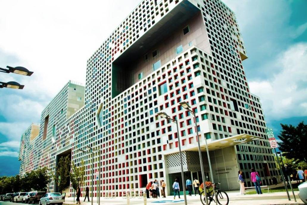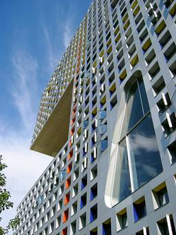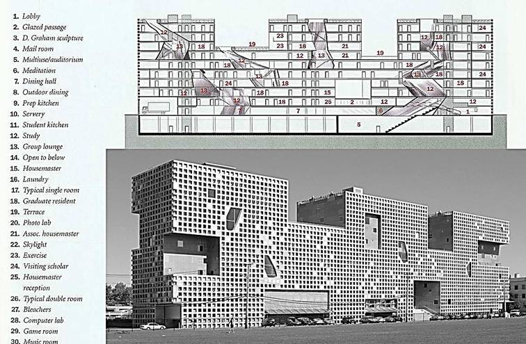有如SPONGE(海綿)的〝多孔性 (porosity)〞做為發展概念,從建築外表可明顯的看出,在密密麻麻的混凝土窗格中(這些混凝土窗格亦為建築結構,減少柱樑讓空間的設計更具彈性),有不規則的孔洞穿插其中。這些〝孔隙〞一方面引入光線,並讓空氣得以對流;另一方面〝孔隙〞成為居住單元裡的公共空間,設置公共設施並提供學生交流、休憩的場所,公共空間,成了街道或小廣場。