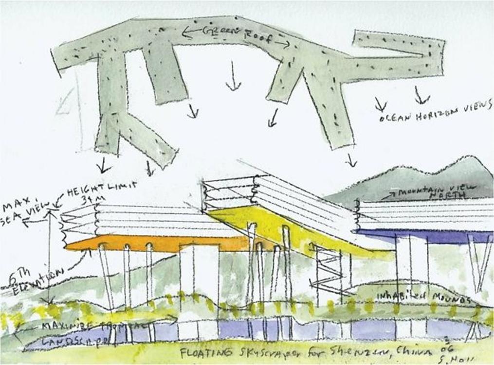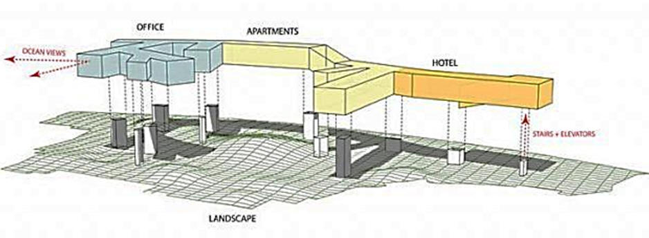 利用懸鎖式結構將建築主要樁柱固定注,型成一個防止海嘯的懸浮架構,使地面敞開,創建一個多孔隙的微氣候調節場域,及對公眾開放的景觀空間。