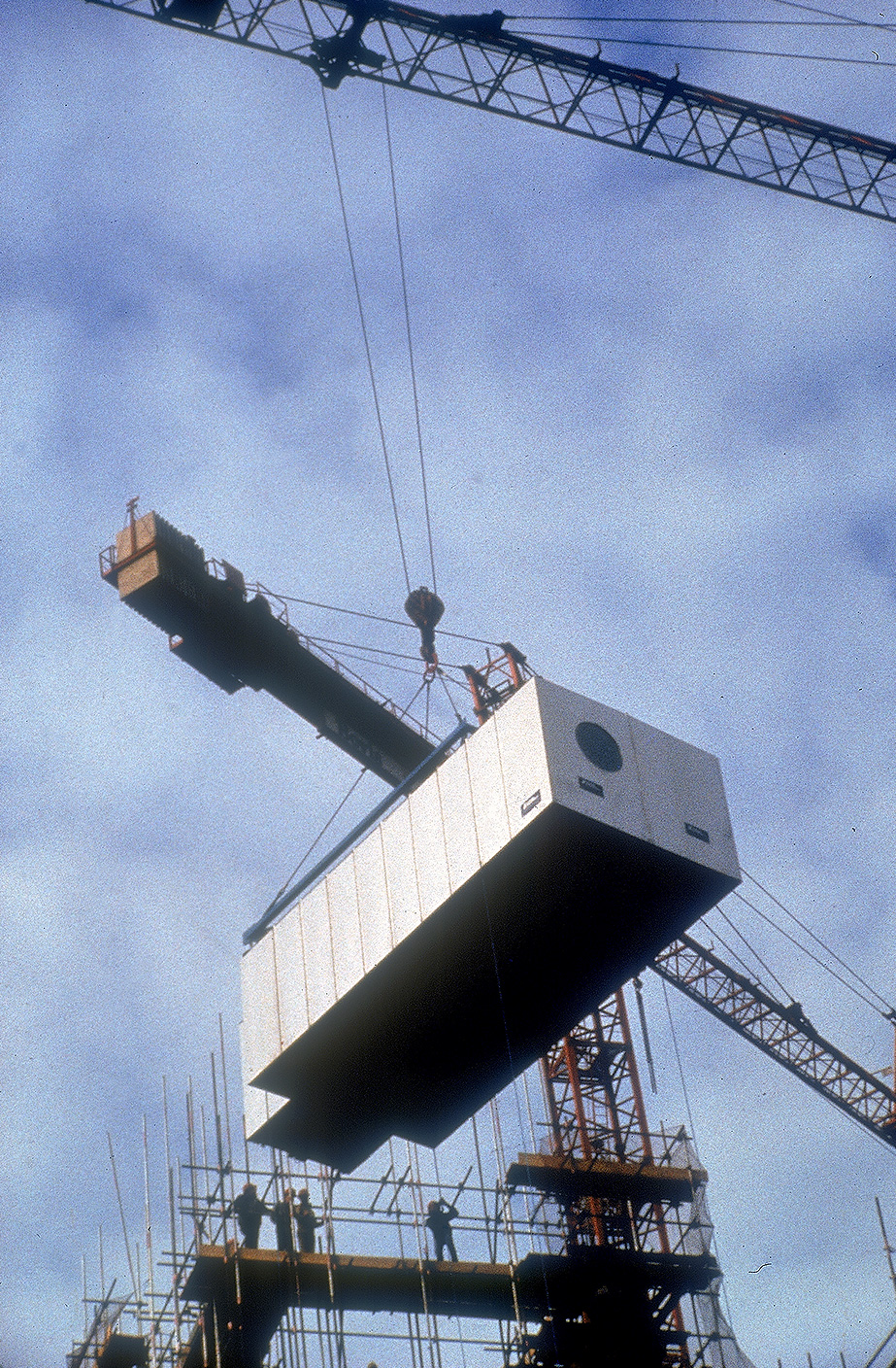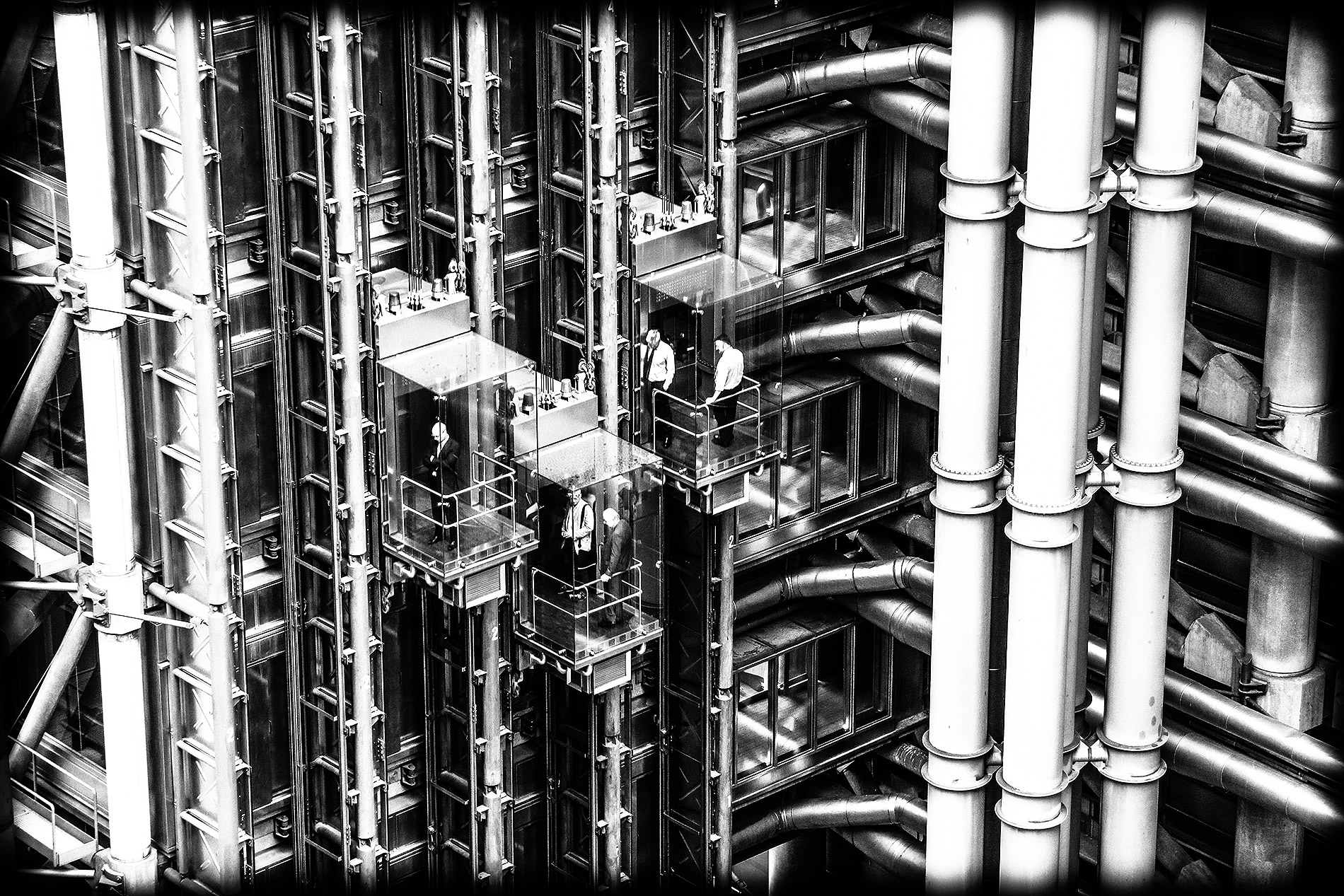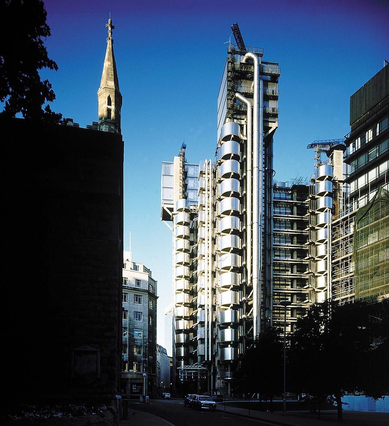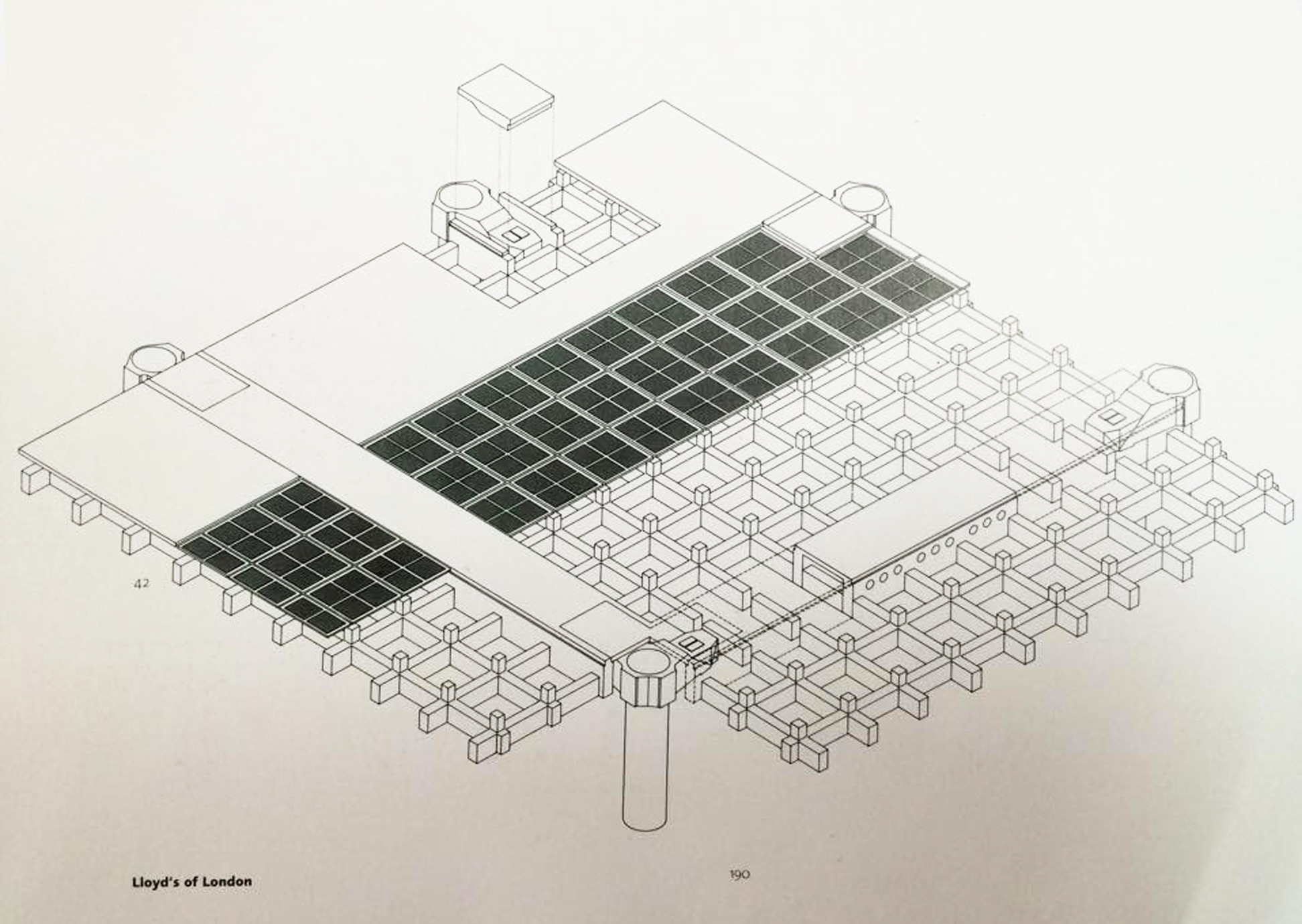 本案例現為倫敦經貿中心,由Richard Rogers操刀設計,玻璃鋼骨結構的矩形平面,外圍有六個衛星式塔樓,主要提供電梯、洗手間以及其他服務空間,設備空間也是設計在屋外。因為被服務的空間是永久存在且較為不變的,而服務空間則是在短期內,可能需要保養、更換,因此本案服務空間採用預鑄的組裝方式。