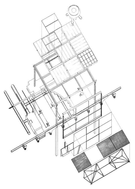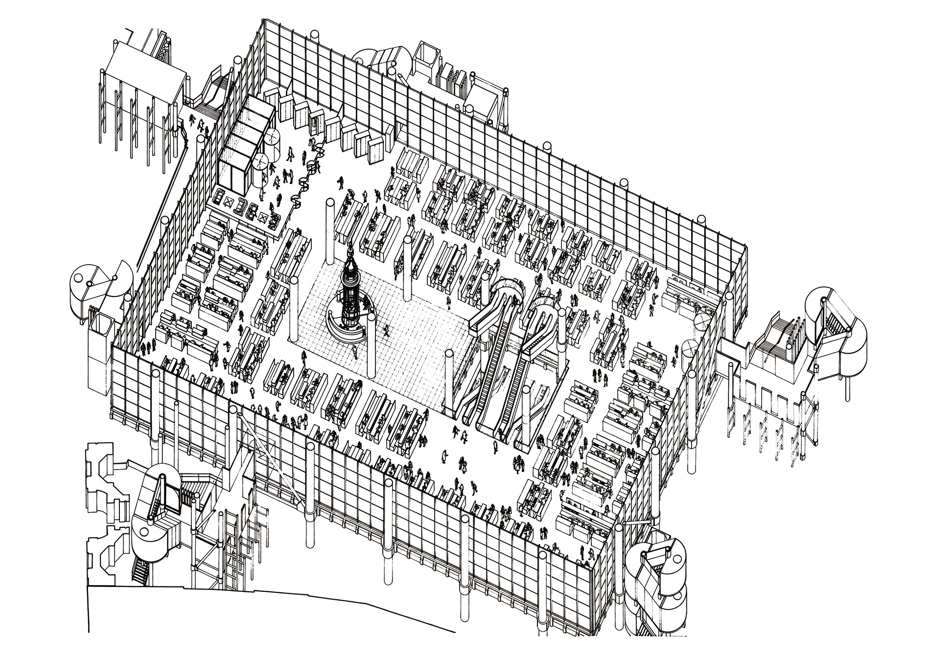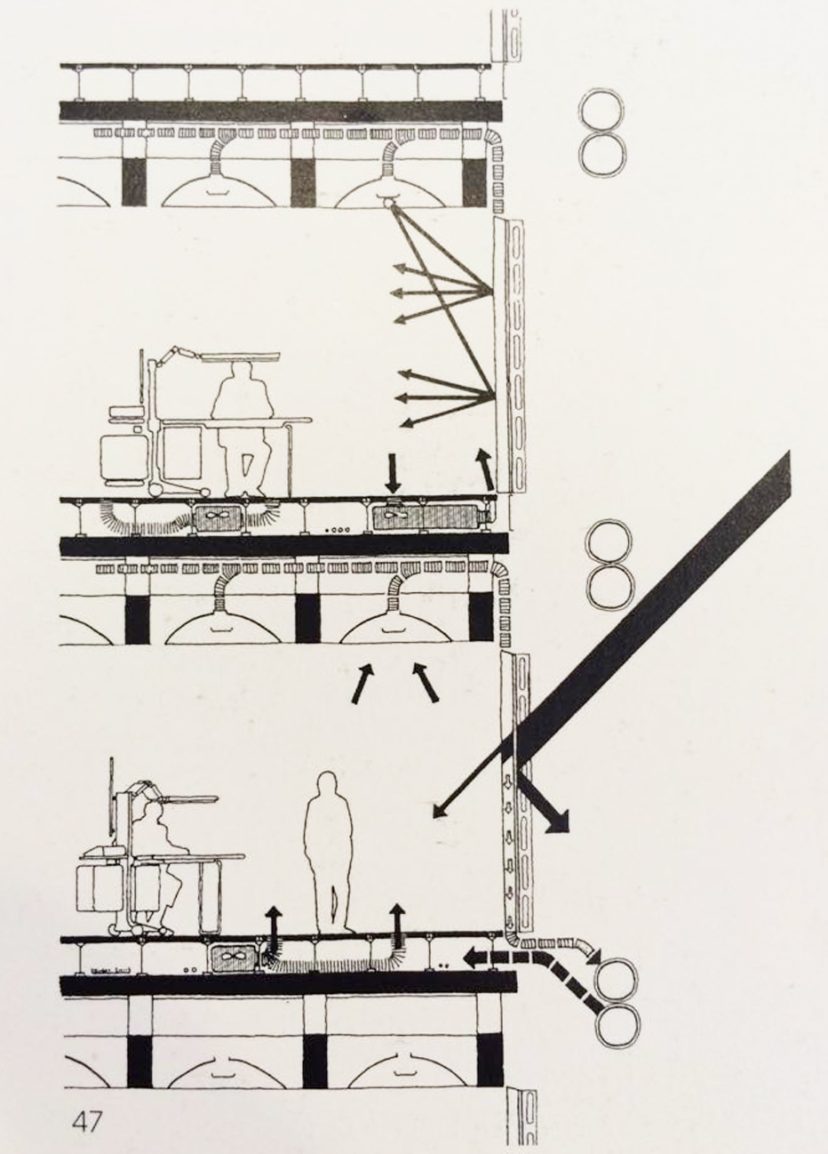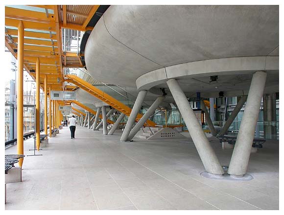 走廊、管道、防火梯、電扶梯、電梯、柱子和繫件等一般會妨礙空間流通之服務管線均安置於建築物外側,設計者曾設想連樓板都可以上下移動,來調整樓層高度,但未能實現Rogers 說戶外梯的設計,不是為了造型而造型,是讓人能領略廣場的活動。