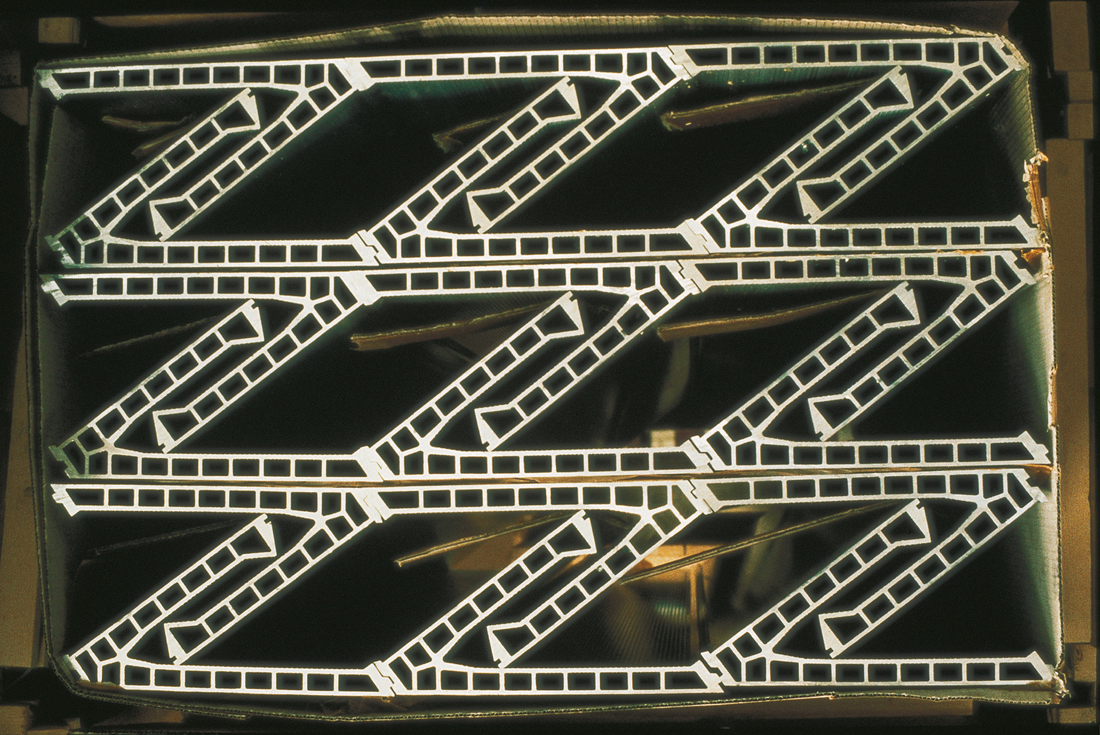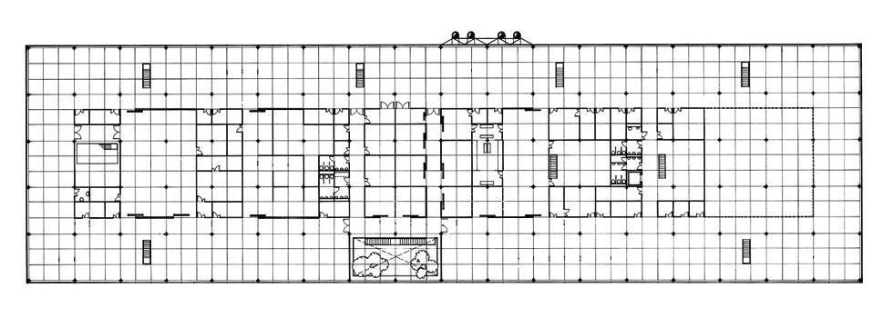 每層樓板尺寸170公尺x48公尺,兩列柱又之間用鋼管組成的桁架樑承托五塊大型開放式樓板樓板。各樓層之間的展示區沒有固定的垂直隔間,是一大片的開放空間,裝有活動式隔屏,管線則從天花板或地板穿出,以免限制彈性使用的可能。