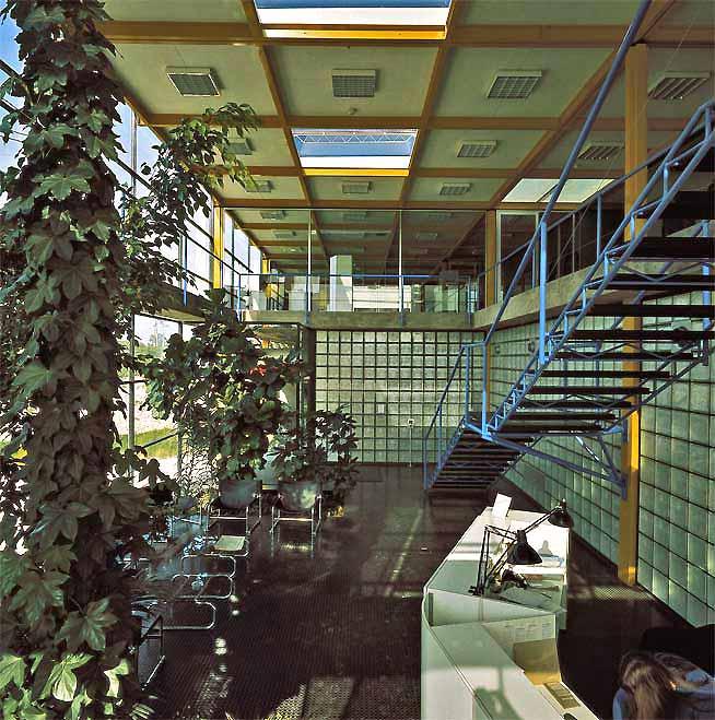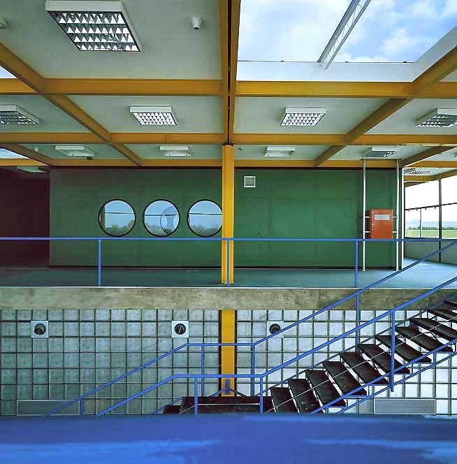 量體建立在混凝土樓板上,並使用預鑄十字柱支撐填充牆與受壓的皮層合板及頂板鋼架。皮層材質括玻璃的與可自由替換的隔熱夾板。