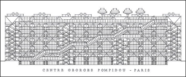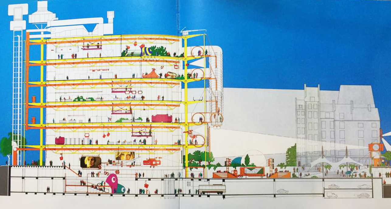 龐畢度中心為Richard Rogers 與Renzo Piano 合作的案子,內部空間機能包含了公共圖書館、現代藝術博物館、工藝美術設計中心和音樂研究中心四個部分。地下層與街道、廣場同一高度,包括會場、劇場、放映室、商店、招待和展示區等公共區域。