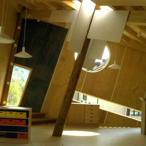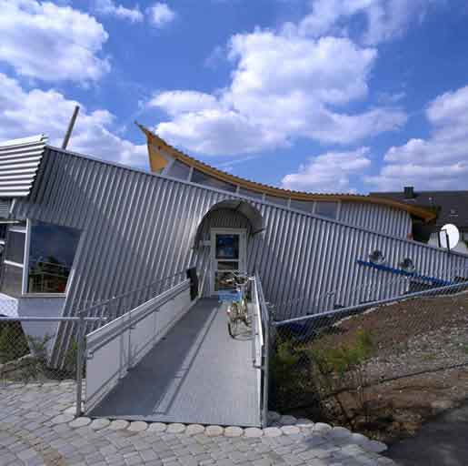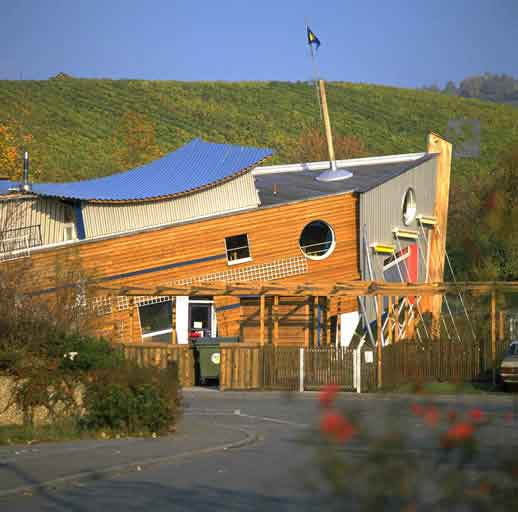 Behnisch在建築上的二個概念就是自然主義與理性主義,這兩個理念則充分發揮在這個設計當中。本設計案是位於德國斯 圖嘉特郊區的一座保育園。基地的南方是一座小山丘,西邊有一條河流,在東邊有主要道路經過,在這 些環境因素的影響下,Behnisch希望塑造的幼稚園是符合自然條件的保育空間,所以在平面的空間配置上就順應了原本的山丘、河流、道路的中間產生了平面的中心,再經由外在環境因素(景觀、氣候…)對應而成的軸線形成了放射狀的平面,平面由三角形,矩形、五邊形的幾何關係所構成,以服務性空間做為每個幾何平面相接之中介空間。在建築原始的造型他希望以船的意像出發來詮釋這座保育園,可以看到一些立面的元素 (桅桿、圓窗) 都有對應到所謂“船”的建築造型,當時在保育園的經費有限的情況下,Behnisch巧妙的運用較經濟的材料(鐵皮、浪板…)塑造出豐富的室內空間,並且在外觀上利用不同材料的堆疊重合形成立面的複雜性與豐富性。