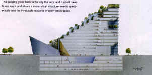 這個設計案緊密地結合了建築物和公園,把建築物佔據的每一寸土地又以另一種形式還給了都市,讓建築物和官貴的都市開放空間和諧地異類共生。