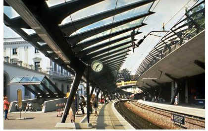 設計構想 在本設計中主要有三個趣的空間;有頂的散步道,懸臂的月台屋頂,以及地下購物中心,由於受到營建施工場地的,限制,小山被挖去了一部分,減少的綠化面積則用散步道來取代,此處可以俯瞰鐵路軌道,並且有天然的綠色屋頂覆蓋。一連5米長的鋼棚架遮在背後,小山距散步場所有4米的間距,在這些支架之間掛著鋼纜繩用以支撐半透光的綠色藤蔓。商業中心位於軌道之下,自然光可以透過一條條月台上玻璃磚的人行道照射到地下層的主要通廊上。 本方案試圖對這一特殊的場地地形求得最佳的解答,這是一個典型的以部面為思考架構進行的設計;橫剖面—可以劃分為三個標高---保持著同一標高的範圍有270米長,平面順著鐵路軌道的形狀呈微微的彎曲,四座高橋跨過這個長條線型的軌道,與上部連接,作為人通道,通道上面有金屬棚頂覆蓋,高架橋連通著下面側的月台和另一側的車站廣場。高架橋連接了現有的道路系統和車站,並且強調了車站上部與下部之間的對比,同時也強調這兩個區域的雙重性。車站和高架橋都是由一些重複的小構件所構成的,這種構造方式,在都市景觀中以大尺度元素的角色,為車站的各種空間凝聚了一個整體意象。