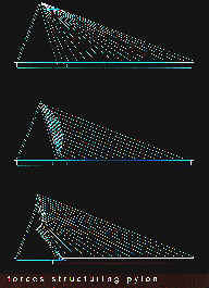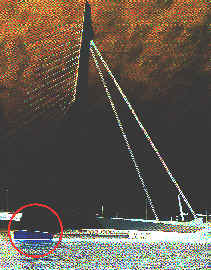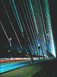 | 這橋樑的不對稱形式,是由天空藍的鋼及長纜線組成的托架結構,而背負傳達支撐力的基礎,是出於群眾的,都市的,結構的和建築美觀的考量。從集會碼頭到塔門的沉箱基礎,其細節的規劃皆屬整體一致性的,而每一個部分的完成都是整體實現的開端,猶如照明計劃的設計,是用來強調此橋樑屬於都市中的加工品,在夜裡,由內而外的特殊燈光從橋體射出,映照在水面上陡峭的纜繩光束就如同白天消失的天際線,橋樑的輪廓因此而淡化消失無蹤。 | |