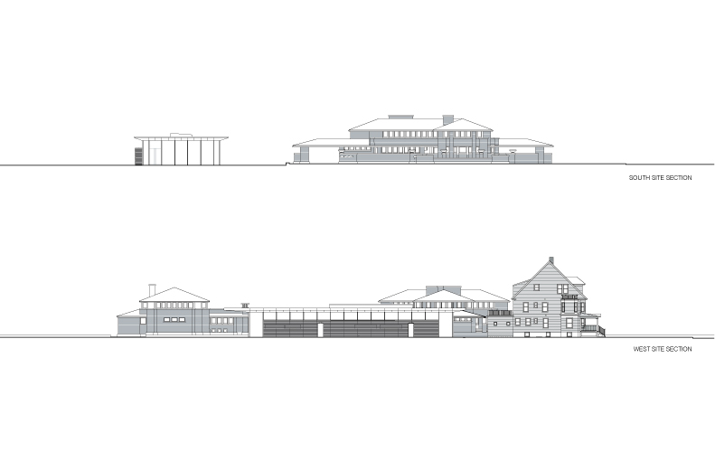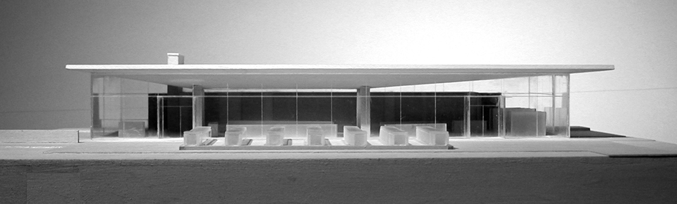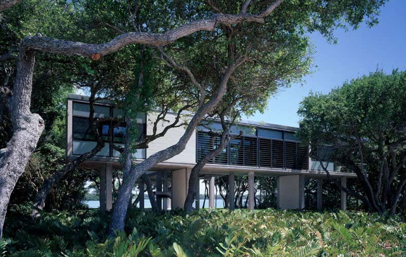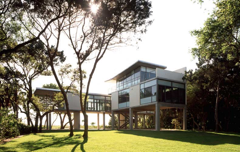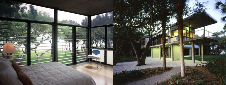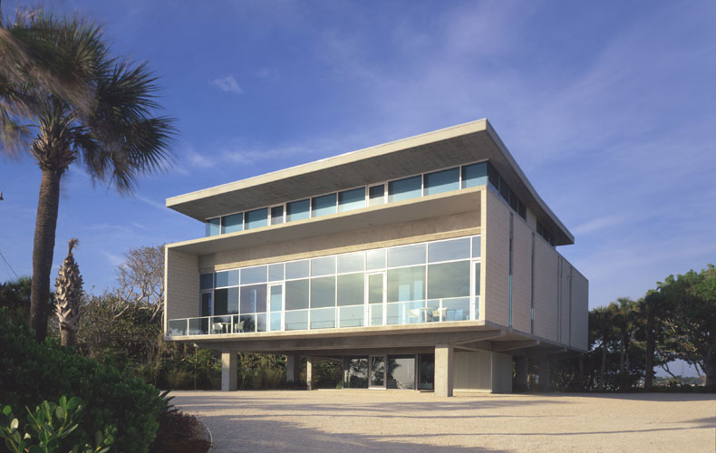 The compound occupies a narrow strip of land near Sarasota, Florida, with borders on two bodies of water, Little Sarasota Bay to the east the Gulf of Mexico to the west. An old coast guard station was located there, and the dormitories and a large dock still remained. The site stretches east-west, dividing into a series of precincts that create a series of intimate, changing landscapes as one moves from gulf to bay. On the gulf side, the coast guard dormitory was remade into a guest cottage. The building sits on grade, and enjoys an intimate beach view, amid wild seagrass and seagrapes and sandy groundcover. The main house sits in the middle precinct, on tall piers to withstand extreme climatic conditions, enveloped in a tropical woodland landscape. The building commands long-distance views in both east and west directions, and hovers over the ground, touching down only at the glass-enclosed vestibule and at the termination of a ramp that stretches toward the bay. Along the bay’s edge, a low citrus grove grid abuts the pool house, pool and terrace, which forms its own geometric shape.