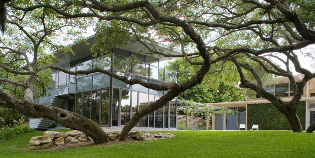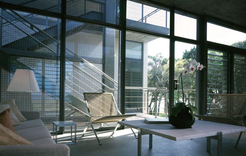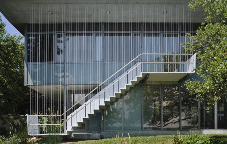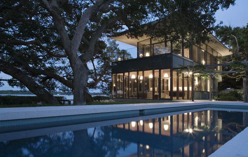 Sheltered by live oaks, palms and mangroves, it is reached by an exterior stainless steel staircase.