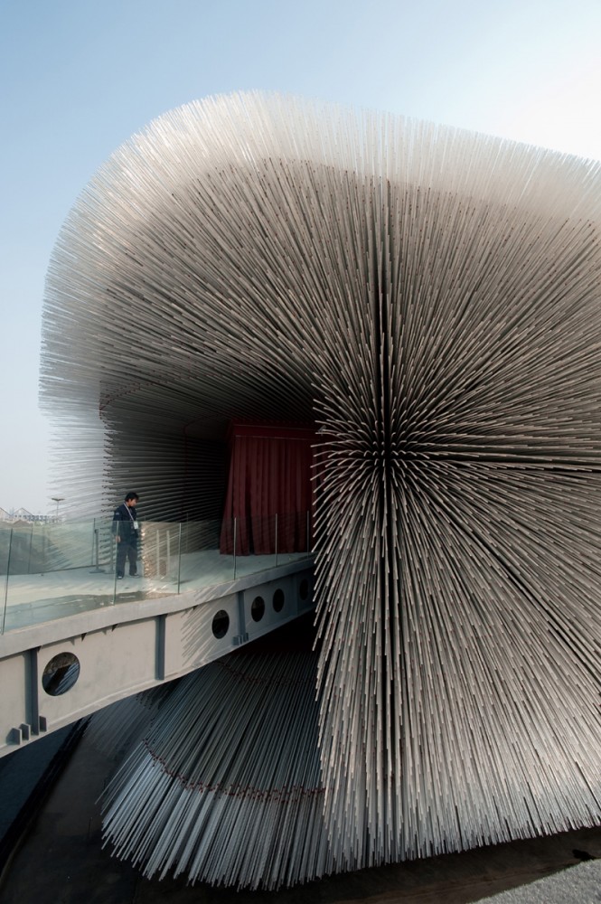 英國館的設計是一個沒有屋頂的開放式公園,展區核心 “ 種子聖殿 ” 外部生長有六萬余根向各個方向伸展的觸鬚。白天,觸鬚會像光纖那樣傳導光線來提供內部照明,營造出現代感和震撼力兼具的空間;夜間,觸鬚內置的光源可照亮整個建築,使其光彩奪目。展區中的 “ 綠色城市 ” 、 “ 開放城市 ” 、 “ 種子聖殿 ” 、 “ 活力城市 ” 和 “ 開放公園 ” 等幾段參觀旅程引導人們關注自然所扮演的角色,並思索如何利用自然來迎接城市面臨的挑戰。 英國館最大的亮點是由 6 萬根蘊含植物種子的透明亞克力杆組成的巨型 “ 種子殿堂 ”—— 這些觸鬚狀的 “ 種子 ” 頂端都帶有一個細小的彩色光源,可以組合成多種圖案和顏色。所有的觸鬚將會隨風輕微搖動,使展館表面形成各種可變幻的光澤和色彩。 “ 種子聖殿 ” 周圍的設計也寓義深遠,它就像一張打開的包裝紙,將包裹在其中的 “ 種子聖殿 ” 送給中國,作為一份象徵兩國友誼的禮物。