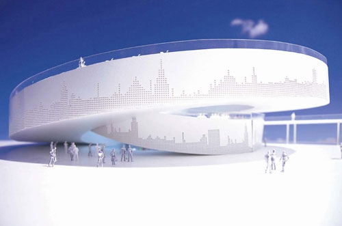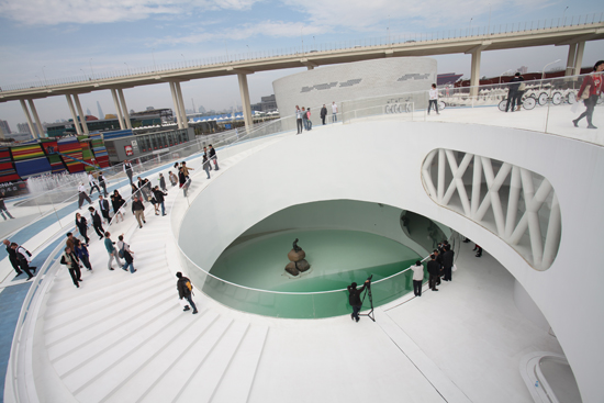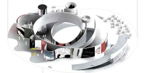 展館由兩個環形的軌道構成,形成室内和室外部分,從上俯瞰像一個螺旋體,與傳統展覽形式有