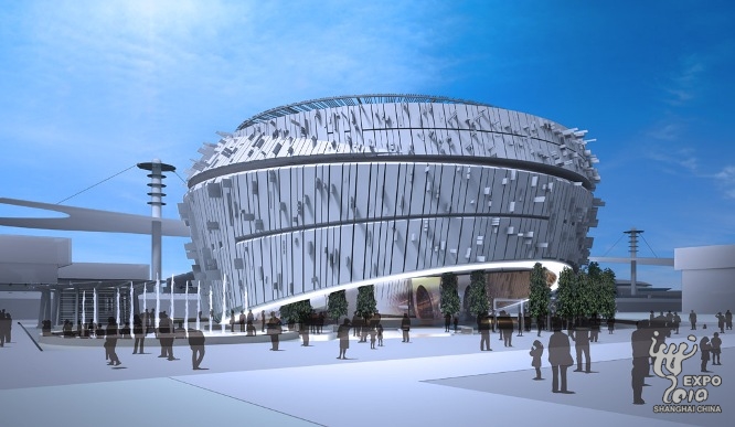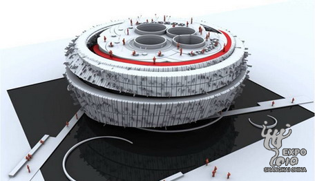新加坡館外型也是以環型的量體為主,而他所提到的四根立柱好像從外表並無法觀察到,這個展館令我感興趣的地方是