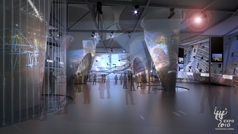 奏。展館整體結構由四大支柱撐起。四根形狀各異的立柱沿著平滑的曲線從屋頂懸掛下來,贯穿上下,相互對應,張力