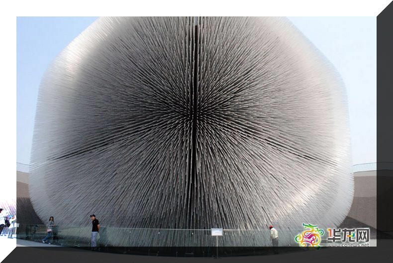 英国馆的设计是一个没有屋顶的开放式公园,展区核心“种子圣殿”外部生长有六万余根向各个方向伸展的触须。白天,触须会像光纤那样传导光线来提供内部照明,营造出现代感和震撼力兼具的空间;夜间,触须内置的光源可照亮整个建筑,使其光彩夺目。展区中的“绿色城市”、 “开放城市”、 “种子圣殿”、 “活力城市”和“开放公园”等几段参观旅程引导人们关注自然所扮演的角色,并思索如何利用自然来迎接城市面临的挑战。