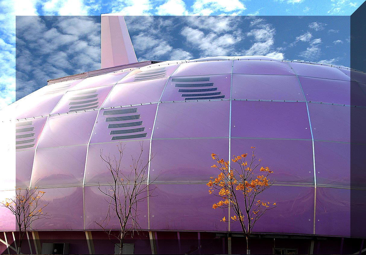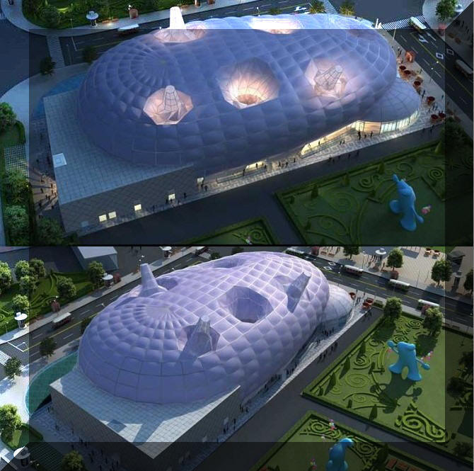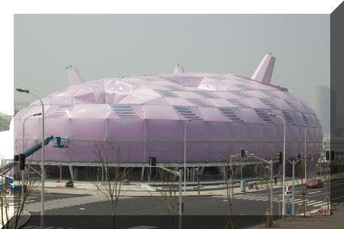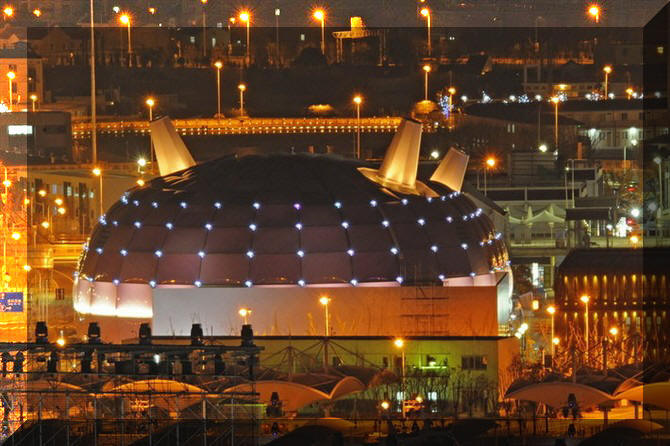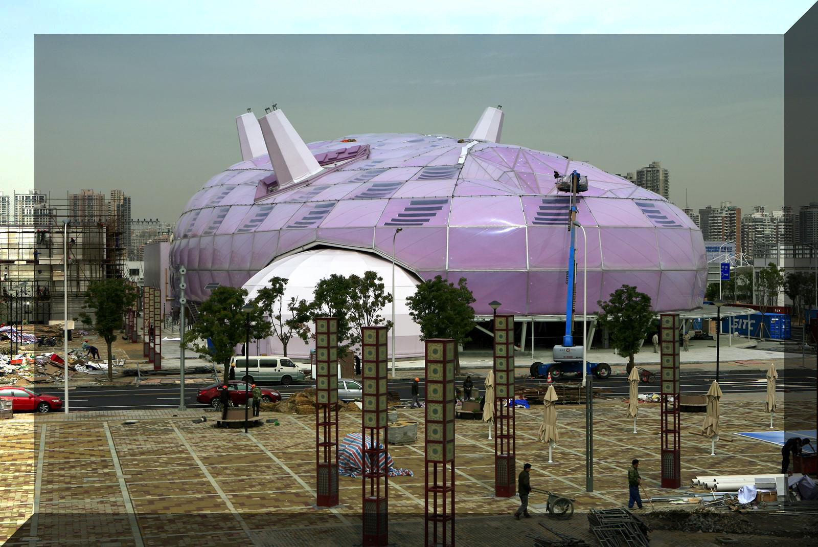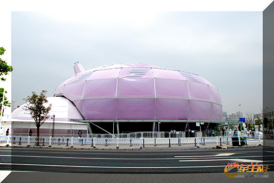 矗立在黄浦江畔的日本馆被昵称为“紫蚕岛”,在24米高的弧形穹顶上,错落分布着三个凹陷的孔洞和三根凸起的圆柱,这种被日本馆馆长江源规由称之为“鼻孔”和“触角”的设计,让日本馆看上去充满生命气息。带有金属光泽的淡紫色外壳,还会随着阳光和夜晚灯光的变幻,表达出或明或暗的各种“表情”,宛如生命体有节奏的呼吸吐纳。