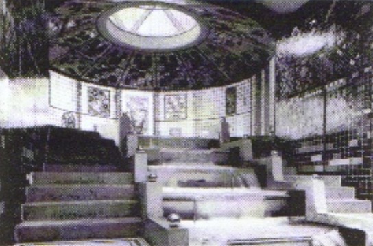 展覽館的光線穿過小刻面的(faceted)穹窿頂,玻璃磚牆照亮了在軸線上分成七斷用玻璃馬賽克畫上線條的小室 ( 圖二 ),照陶特的說法,此形具有城市冠冕(Stadtkrone)的作用。