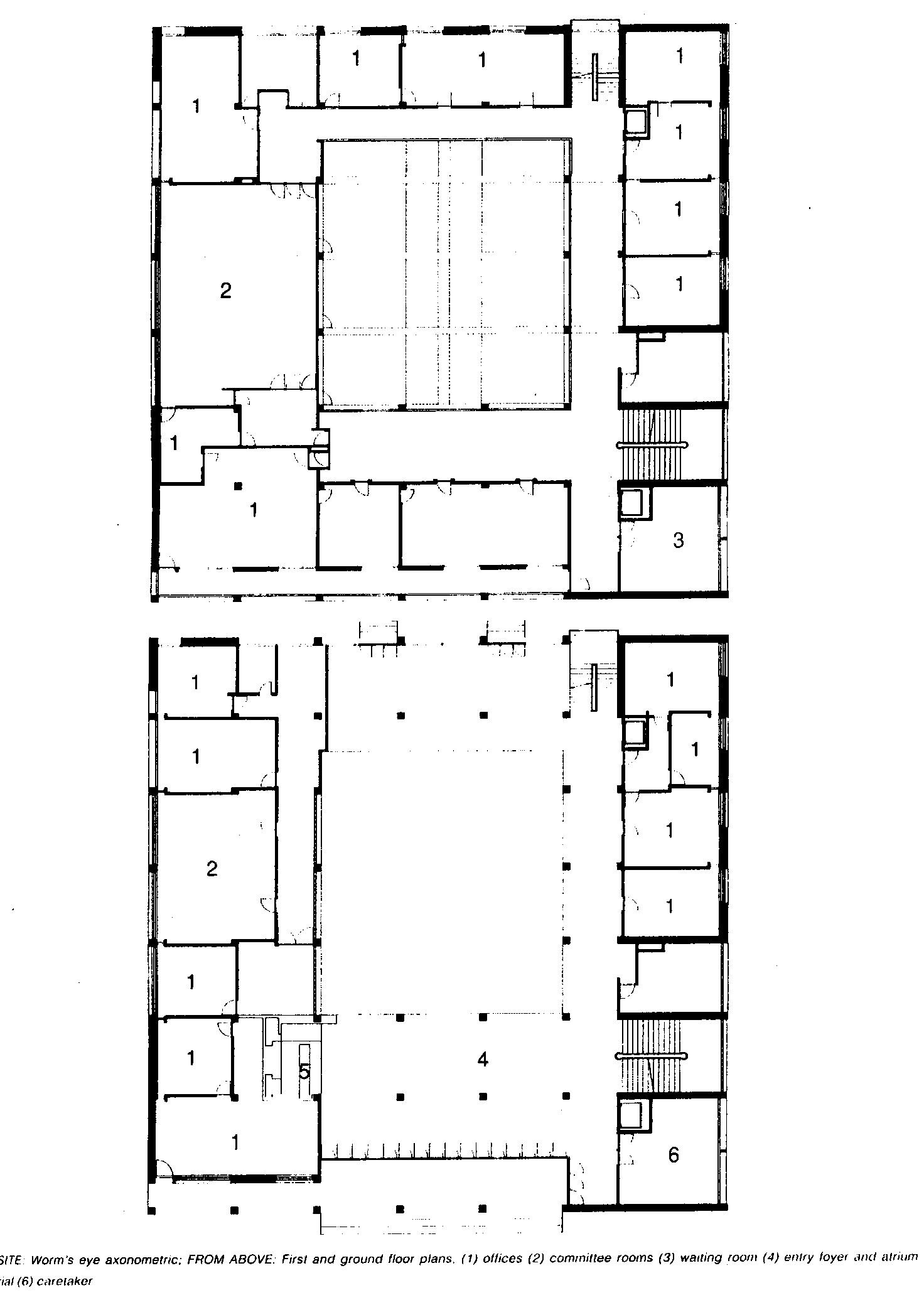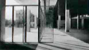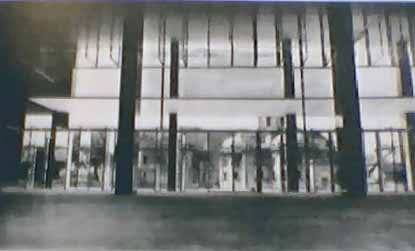建築物利用玻璃門來隔離門廳與廣場(圖10),當玻璃門(圖13)以電鈕開啟時,中庭便與廣場連通,允許示威的人流從街上湧進室內;門廳上方使用鏡面天花(圖10),是希望反映出下方的梁柱構架,創造出一種無限梁柱構架的幻象。接著是在會議室的設計上,內懸巨幅墨索里尼肖像(圖14),而且另開闢一個專室紀念墨索里尼1922年的進軍羅馬。總之,這件作品是一個超越意識形態的考量所創造出的一種形而上的空間效果,整座建築如同一個連續性的空間矩陣,沒有上下左右之分。另外,建築物恰好配於一個歷史性的都市核心中,所以立刻創造出一個兼具技術性和紀念性的作品。