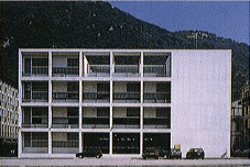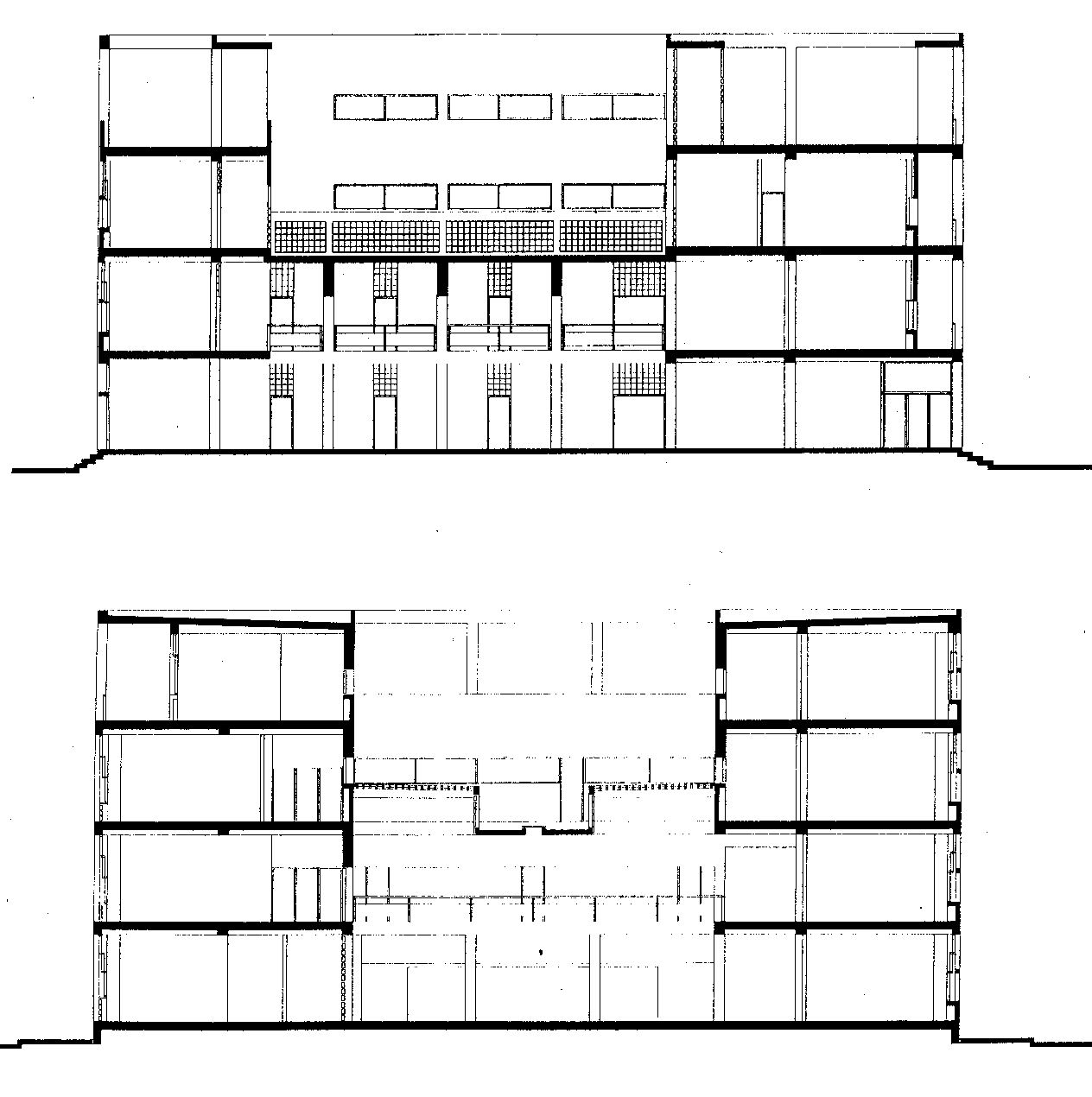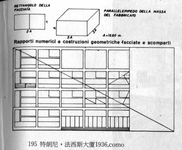 公尺的一半。這個半立方體表現出非常理性的幾何關係。經分割出立面,窗戶處理都是為了表現內部中庭,而且忠實的顯示出建築物結構系統(梁柱式構架)(圖5)。窗戶的分割亦與整體立面的對角線有著緊密的關聯性(如圖7)。