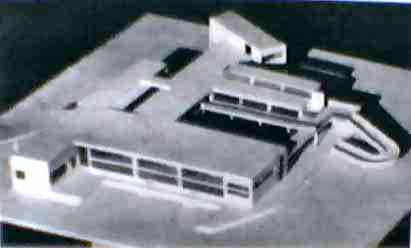 Sant’Elia托兒所位於兩條道路的交角處,是完整街廓中的一角,基地形狀是一塊不規則的四邊形(圖2)。整個建築物的機能配置非常明確(見圖3、圖4):基地南半部是教學空間包括四間教室;西北部是餐廳空間;圖面東方有一通往屋頂的坡道;西方是主要入口門廳和一間休養室。這些空間成〝ㄩ〞字形排列,圍塑出中庭空間。