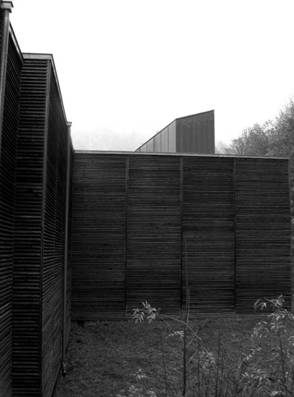1. 羅馬考古基地保護所 為了瑞士庫爾(Chur)舊市區的三座羅馬時期的建築牆基遺址而建造的保護所,在機能上需要維持通風與遮雨並提供參觀的動線。保護所試圖對羅馬時期的量體進行抽象的再製,三座木百葉方盒子順著三座羅馬時期牆基的外圍向上生長,彷彿在現代城市地景上抽象再製羅馬時期建築,構造上以輕質的木百葉組合成牆體讓外部光線及空氣進入保護所內部 (圖1, 2)。