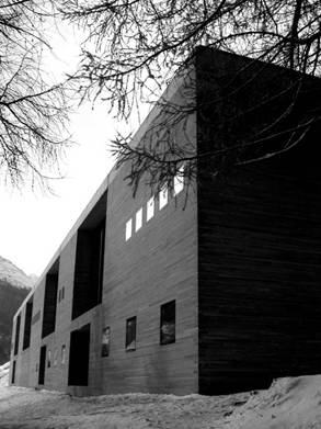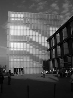 3. 柏瑞根茲美術館 美術館的基地位置在奧地利柏瑞根茲的康斯坦(Constance)湖邊,尊托將展覽空間獨立出來自成一個方形半透明、地下兩層、地上四層的建築體,其他附屬的機能如咖啡館、圖書館及商店集結成另一座黑色方形三層樓的建築,兩座建築間形成一個小廣場,兩座建築的入口即在這個小廣場的周圍。美術館建築以毛玻璃、鋼以及混凝土組成,外觀像是一個光體,吸收天空不斷變化的光線及湖上的薄霧,反映光線與色彩同時暗示內部狀況,未經特殊切割的毛玻璃,一片片完整獨立的由鋼結構組件結合成如魚鱗狀的雙層玻璃帷幕(圖7, 8, 9, 10)。