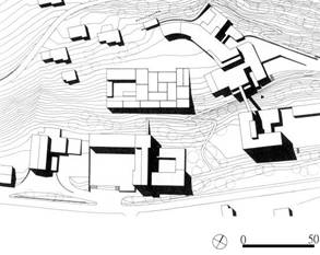 2. 瓦爾斯溫泉浴場 瓦爾斯溫泉浴場的基地位於一座坡地上,基地的上方及下方各有一棟60年代興建的溫泉旅館建築。浴場分為三個高程,上層是浴場主要空間,包括更衣、基本清潔沐浴、廁間、土耳其浴、戶外36℃溫泉、一座戶外石島、戶外的沐浴石泉、室內32℃溫泉、42℃火泉、12℃冰泉、13℃的石穴噴泉、30℃的花瓣池、沐浴石泉、飲用石泉、聽覺石泉、按摩室。中間層一半的空間是個人按摩室,另一半是儲水設施及機電間、最下層是設備層。浴場建築為混凝土結構,片麻岩貼面,以獨立的結構嵌進山坡內,以青草覆蓋巨大的方形石料量體,深陷進山裡並與坡度密合(圖3, 4, 5, 6)。