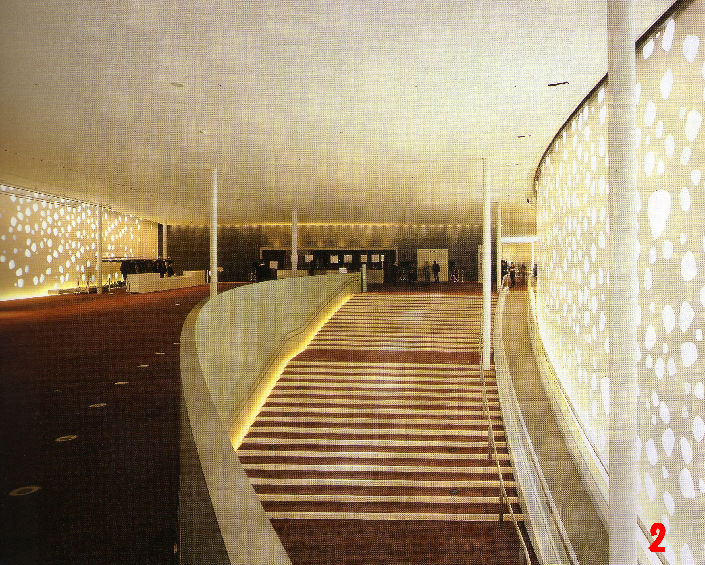 而座位則是在最南端,外牆為圓弧狀、室內是環繞形的門廳,將南側所有的樹木得以保留。