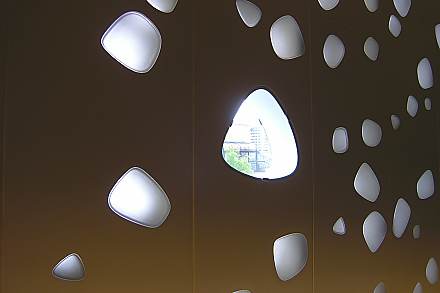 在外觀使用GRC鑲嵌板再以玻璃嵌入,隨機的開洞,使柔軟的光線透入室內,夜晚外牆