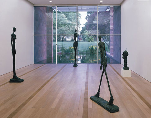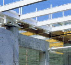 此美術館曾被羅傑斯描述為格外輕盈的建築。從施工過可以看出使用的材料除了一些比較構造性質的牆 面之外,大多是以鋼構鐵件為主( 下圖左 )。 而室內也用很簡單的劃分來區隔各展覽空間( 下圖中 )。室外 部分則可以清楚看到他的結構行為,將獨立柱立於水中更顯得立面的輕盈( 下圖右 )。