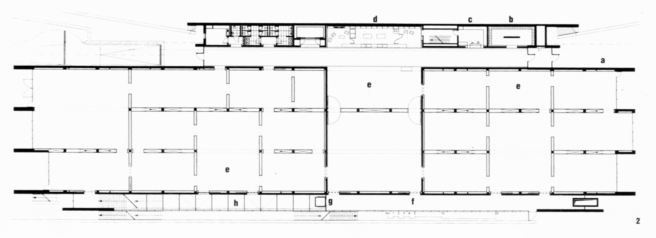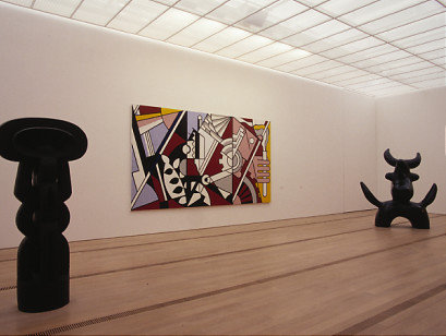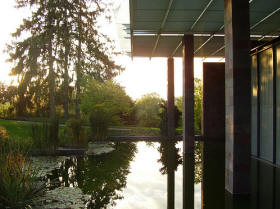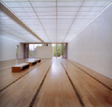 簡單的室內展覽空間放置著藝術品,向大面的窗口看去可以感覺到,他利用室內牆面的延伸直到室外, 而下方則是水面,更顯得景色的深度與層次感,遠方則隱隱約約可以看到當地特色的建築物,而他在這 邊牆面的材料改變不只可以區分室內室外空間,也藉由這種貼面材質來呼應當地的建築物。 而除了這些材料的運用,可以發現他天花的光線時分的平均分布在展覽空間之中,這也是美術館最需要 的光線種類。他利用天花以及屋頂的多層構造將光線中有可能危害藝術品的部分去除,經過反射、折射 、在經過鐵絲網格的打散,將光線平均且柔和的散布在室內空間。 另外可以發現他的地板鋪面有著許多網格狀的面,這些則是利用高架地板,將風管埋於下方的出風口, 可以很好的控制通風與溫度,也不會因為有送風機而破壞室內的完整性。 而貝耶勒美術館也是一棟名副其實的綠建築,除了從上述的天花板的自然採光構造、呼應基地周邊關係 等等之外,可以從平面圖了解到,他清楚的將美術館分層三段,第一段是入口等服務性空間,並且還具 備隔音的功能,因為這面面相著大馬路。而另外一面是面對著大草皮,Piano在這邊使用了一個挑空的空 間並且有著大面的開窗可以欣賞景色,但是除此之外這個空間還具備著隔溫層這樣的一個功能,可以說 整個展覽館的周邊表面都利用了像是雙層表皮的原理製造出一個隔溫的空間層,可以讓室內保持在溫差 起伏微小的狀態,也能夠節省通風空調設備的耗能。 Back