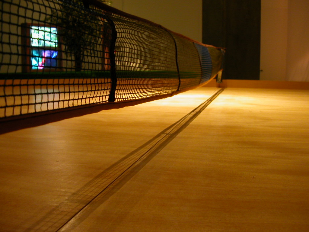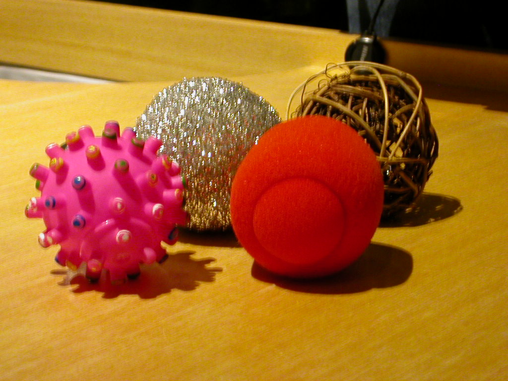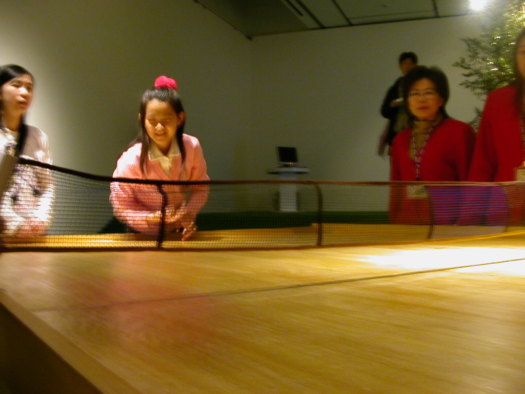 | 特製球桌的球洞(球掉入則得分) | 有架高的球網(球從底下經過) | 各式材質觸感的"乒乓球" |