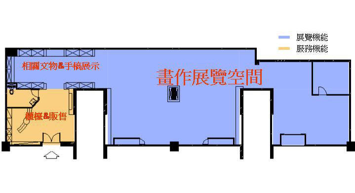 空間分配上以展覽機能佔據紀念館的大部分,此舉可能是館方希望盡量將李先生作品完整呈現,展覽空間中又有小部分作為文物手稿等資料展示;入口處作為服務機能的櫃檯、販售以及廁所等。據吾人兩次造訪的經驗,展場中雖搜羅了畫家各個時期代表作,以展示數量來說尚稱豐富,但在欠缺規畫的情況下,若不是事先做過功課的訪者多少會讓人有無規則可循的感覺;展覽空間及服務空間的比例不但失衡,關連性也相對薄弱。