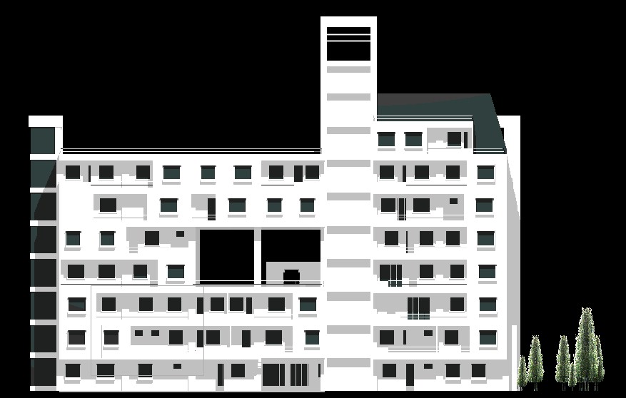 2.建物正立面左側利用框架式桁架與陽台結合,而右側則外掛一實牆配合4、5樓的挑空 挖出矩形,在core 的兩側塑造實與虛的對比。