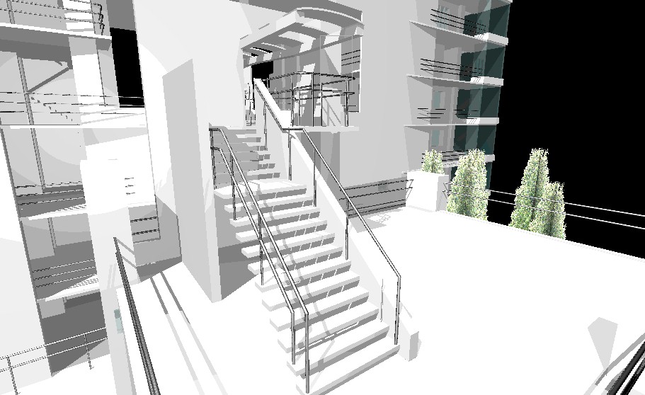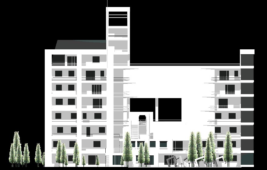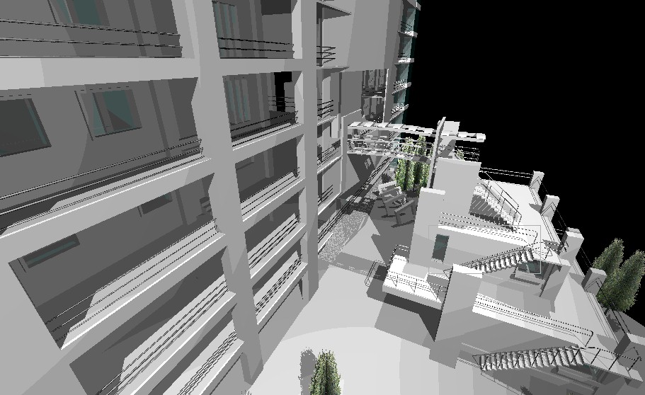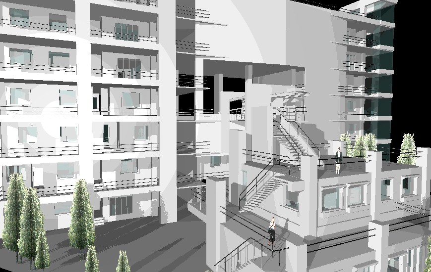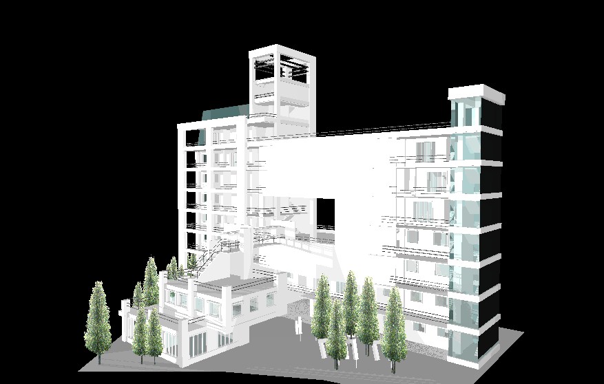 1.利用右側梯間塑造玻璃盒子的意象,夜間配合燈光照明將更加醒目。 2.建物正立面左側利用框架式桁架與陽台結合,而右側則外掛一實牆配合4、5樓的挑空 挖出矩形,在core 的兩側塑造實與虛的對比。 3.庭園中央為公共空間,以屋頂作為轉折及緩衝。 4.以空中走道相互銜接住宅及公共空間。