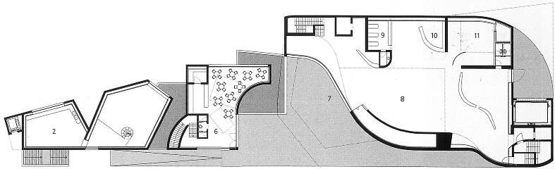 連接展示空間的垂直動線包含一個環繞建築量體形成懸臂式的畫廊(cantilevered galleries)斜坡,部分在中庭內,部分在中庭外面。