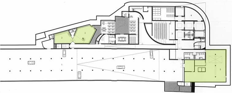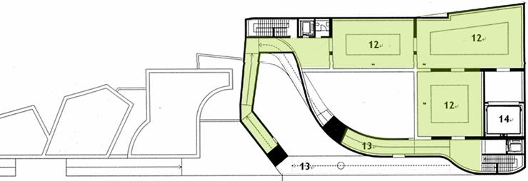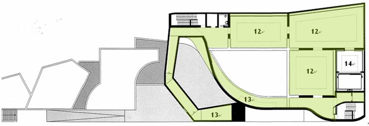 連接展示空間的垂直動線包含一個環繞建築量體形成懸臂式的畫廊(cantilevered galleries)斜坡,部分在中庭內,部分在中庭外面。