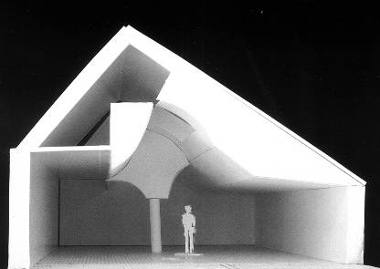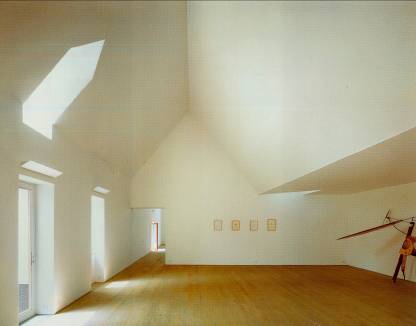 美術館的頂窗側光的反射和一根獨立的柱子結合在一起,表示當代藝術的工作必須找到他們要找的地方和意義。