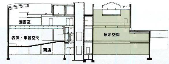 「展示空間」以三角天窗間接採光並以矩形的開口及懸吊式的天花板空隙,加上懸掛擴散器以保護藝術品被陽光直射,