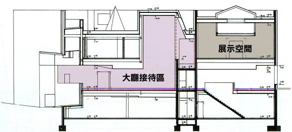 靜態的「展示空間」與動態的「附屬服務空間」以帶狀的樓梯聯繫/區隔。